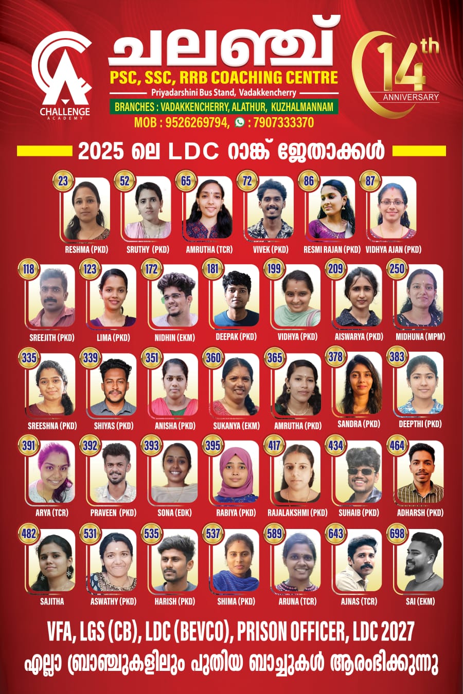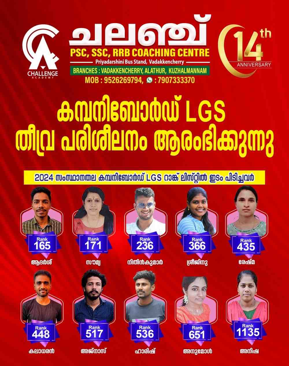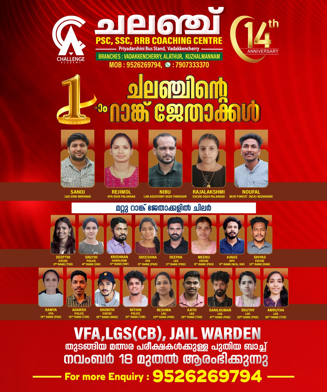 Challenge Academy, located in Vadakkenchery, Palakkad, has been a trusted name in PSC exam training since 2010. With 15 years of dedicated service, it has guided countless government job aspirants under the mentorship of an experienced Guru, a former Kerala Government employee. The academy takes pride in producing numerous rank holders, ensuring quality coaching and individual attention for every student.